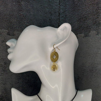 elles sont composées d'une pièce de monnaie chinoise ancienne ching-dynasty porte chance en alliage fin et durable couleur bronze antique de 20 mm environ d'une forme ronde de 16 mm nacrée en coquillage d'eau douce avec motif doré.