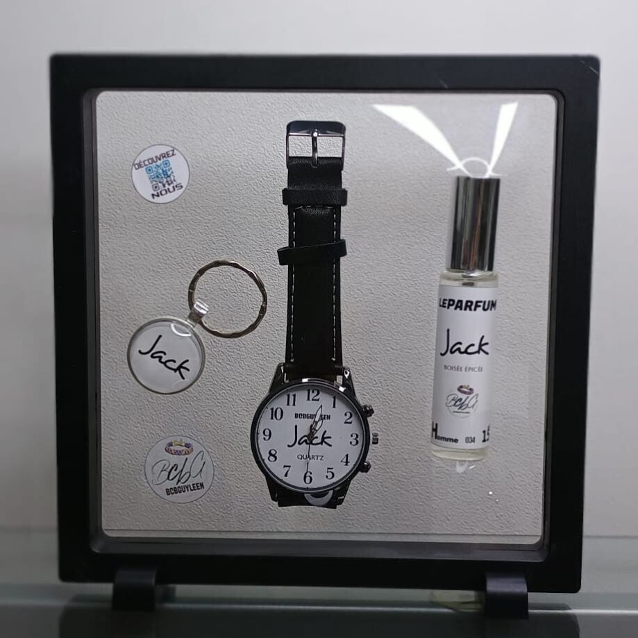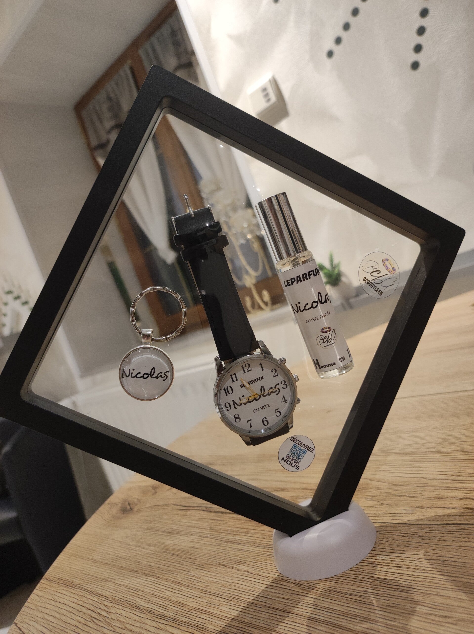 Coffret de présentation original en vinyle transparent Epaisseur 2CM dimensions 18 x 18cm. Prénom à préciser lors de la commande dans note du destinataire. Tous renseignement en mail: voitequefrederic@gmail.com ( quelques variante suivant arrivage ou sur demande: boitier chromé, bracelet blanc, marron, possible montre à gousset.