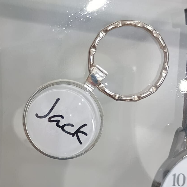 - Un porte clé en alliage 25mm, prénom Noir sur vinyle blanc sous verre loupe assemblage résine U.V, anneau de 30mm en acier inox.