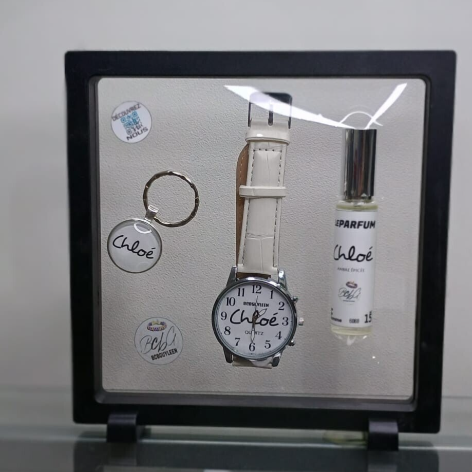 Coffret de présentation original en vinyle transparent Epaisseur 2CM dimensions 18 x 18cm. Prénom à préciser lors de la commande dans note du destinataire. Tous renseignement en mail: voitequefrederic@gmail.com ( quelques variante suivant arrivage ou sur demande: boitier noir, bracelet noir, marron, possible montre à gousset.