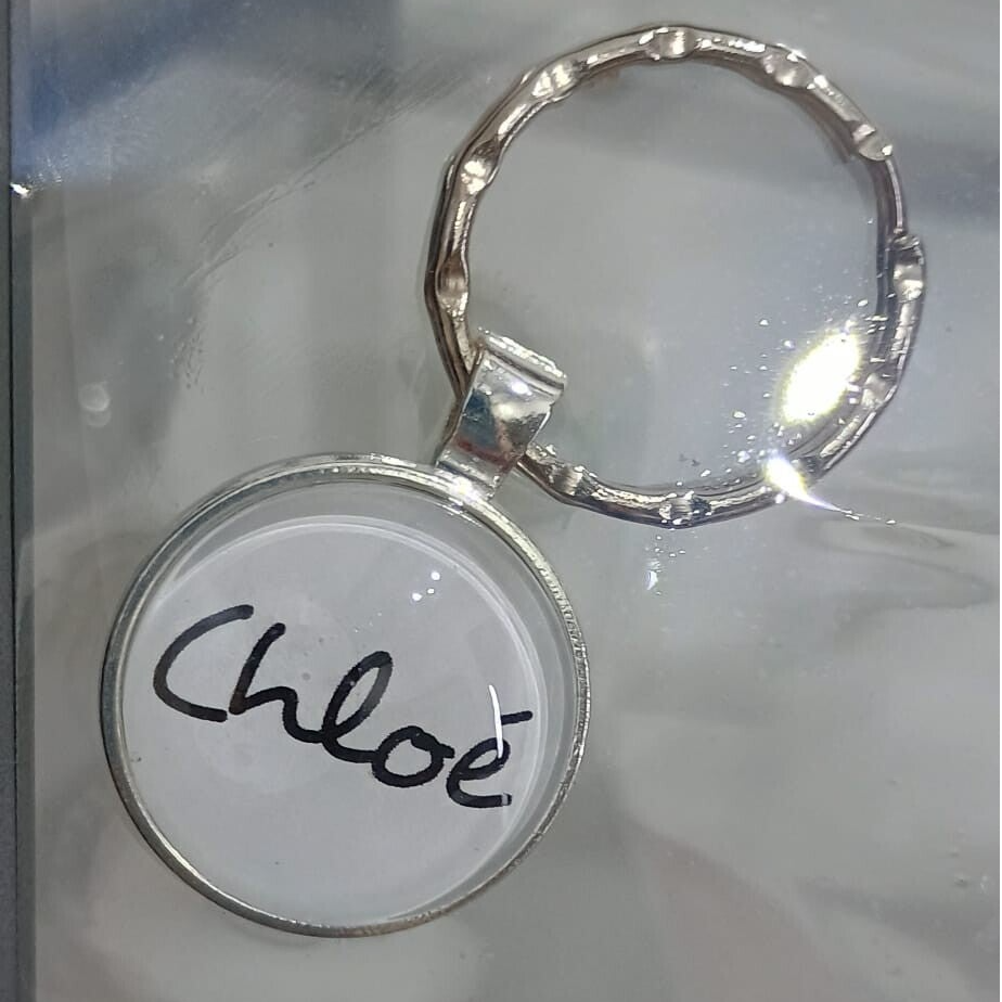 - Un porte clé en alliage 25mm, prénom Noir sur vinyle blanc sous verre loupe assemblage résine U.V, anneau de 30mm en acier inox.