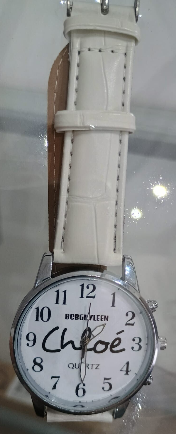 - Une montre à quartz personnalisée diamètre du boitier 40mm, bracelet blanc, prénom Noir sur vinyle blanc.