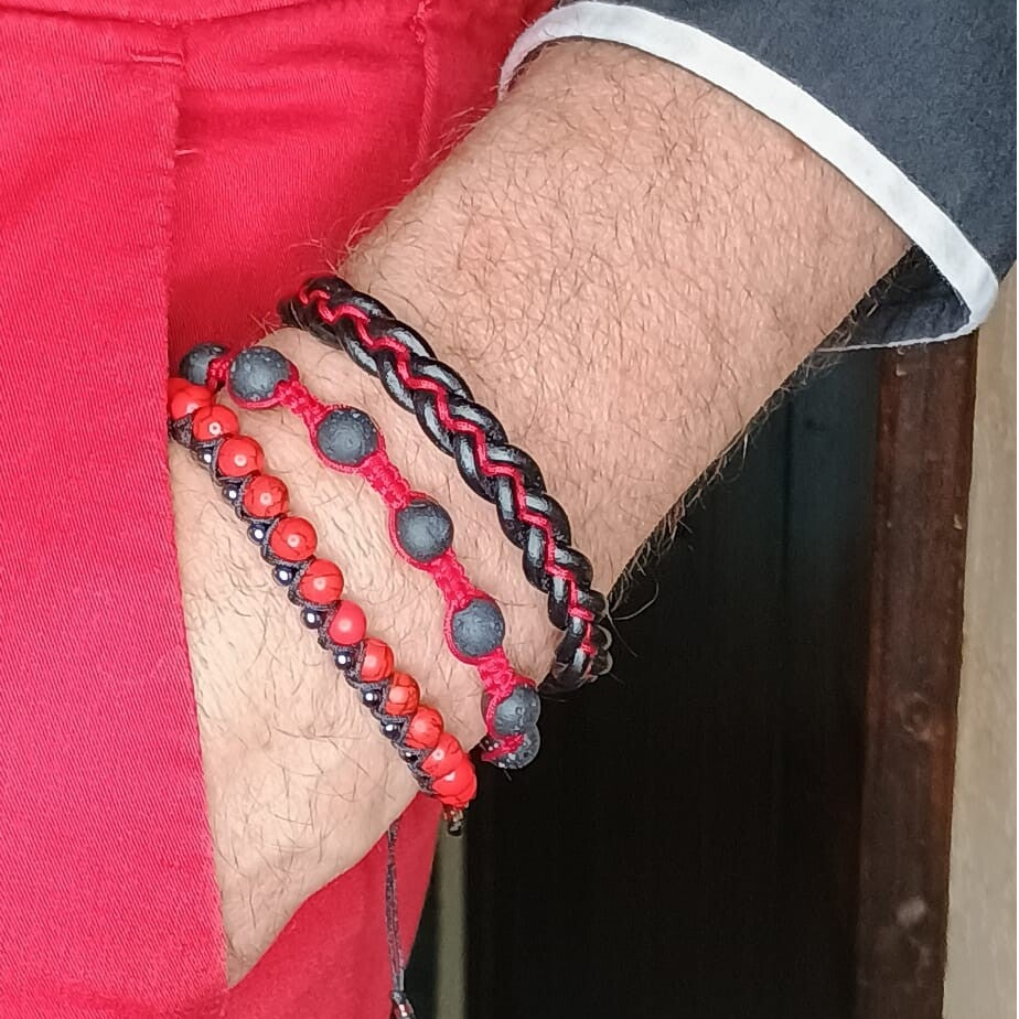 Bracelet composé de Pierre ronde 6mm en agate rouge et de perle ronde 3mm en magnétite noir de Gall stone assemblées par un tressage particulièrement original en fil nylon noir permettant au petite perle magnétite d'être maintenu sur le côté des perles en agate rouge. ce bracelet est ajustable